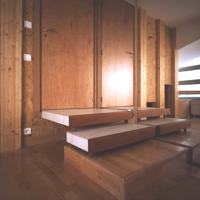 formes complexes des niveaux supérieurs. Réalisés préalablement, les panneaux à ossature bois ont ensuite été posés en place. Le matériau de finition intérieure est également le bois : des cloisons de Triply viennent en parement des cloisons et des murs d’ossature et participent à la