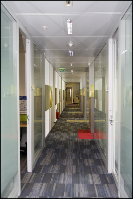 - Performance : La transparence maximale choisie facilite les échanges internes et, de l’extérieur, donne une image d’ouverture et d’accès à l’information. Les cloisons parallèles aux façades sont translucides et laissent entrer la lumière et le regard. Les espaces très ouverts et le cheminement simple et évident sont animés par un jeu de couleurs sur les sols et les parois opaques.