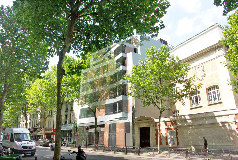 Le programme se stratifie verticalement jusqu’au R+3 pour les différents espaces de l’ERP et du R+3 au R+6 pour les logements. Cette stratification est lisible en façade principale grâce aux retraits et oriels spécifiques à chaque niveau et aussi grâce aux généreuses ouvertures et aux bardeaux de terre cuite qui se dilatent entre des linteaux filants en béton enduit.La circulation axiale horizontale dessert les locaux sur toute la longueur des niveaux de l’ERP favorisant le partage des espaces utilisés tantôt par le lycée, tantôt par la paroisse. Les courettes en quinconce de part et d’autre de la circulation permettent la pénétration de la lumière naturelle jusqu’au Rez-de-Chaussée.