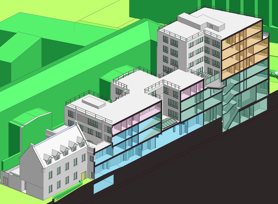 En lieu et place d’une église provisoire devenue local paroissial en 1923, le nouveau projet se développe sur une parcelle longue avec une faible ouverture sur l’espace public. Il est conçu comme un bâtiment unitaire avec une certaine souplesse d’aménagement comprenant un programme mixte aux destinations et usages très variés.